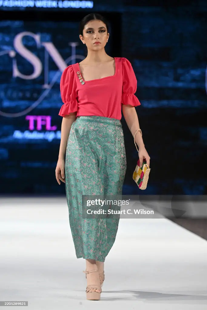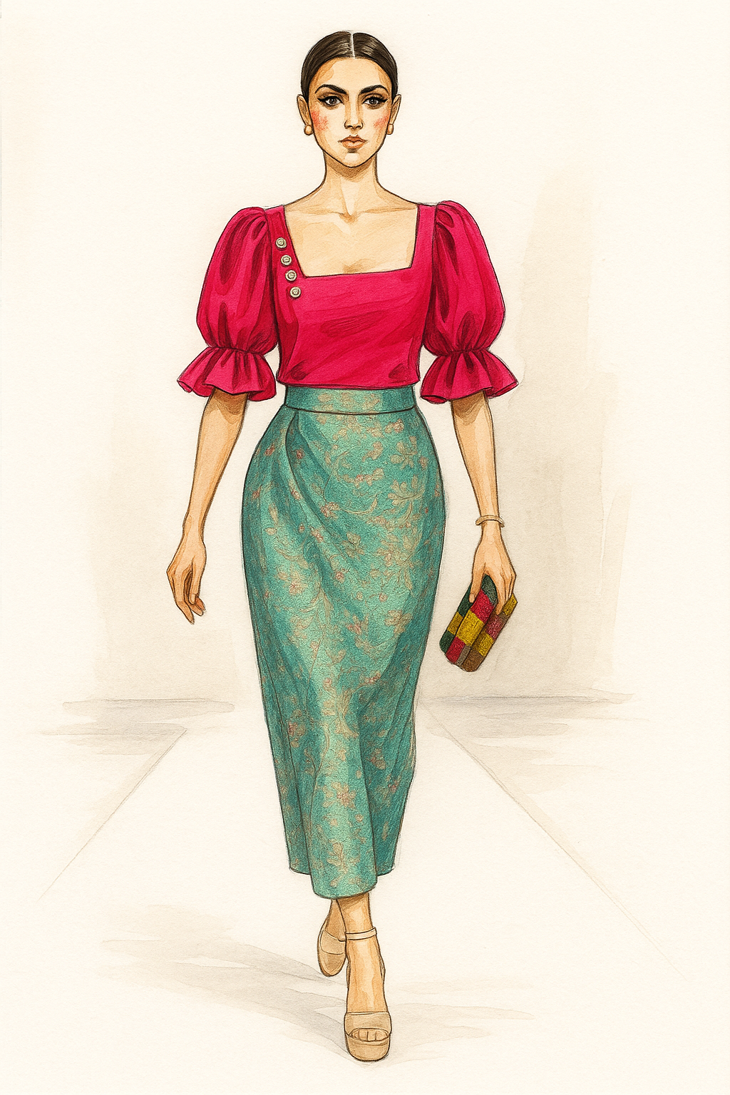 This midi pencil style silhouette skirt beautifully blends cultural richness with modern elegance, perfect for an upscale fashion event or festive celebration. The bold top contrasts effortlessly with the intricately woven skirt, celebrating both structure and softness.