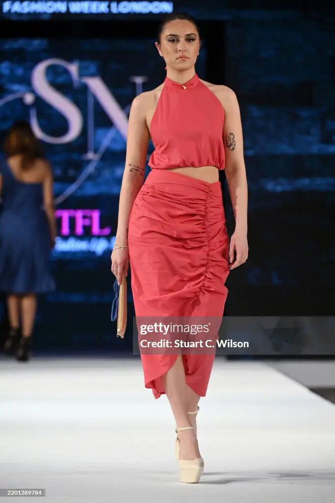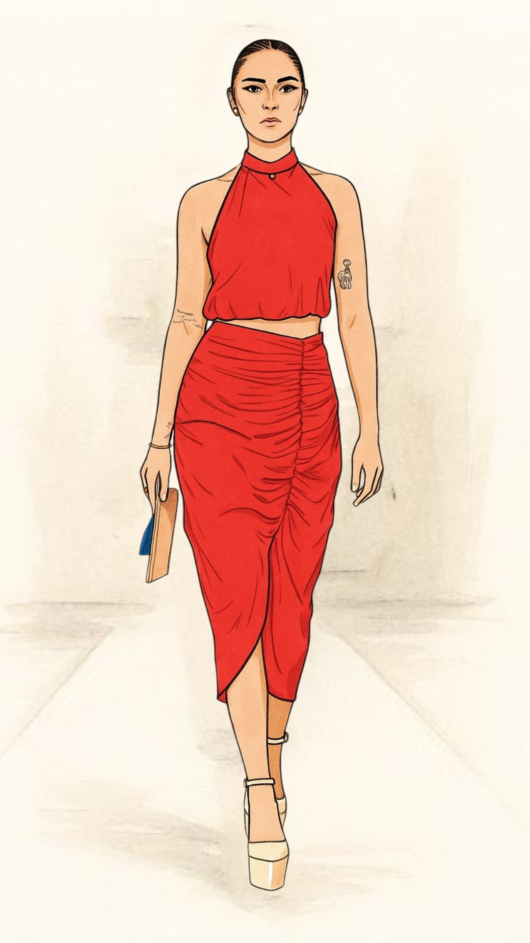 This ensemble features a structured halter-neck crop top paired with a ruched, sculptured midi skirt. The silhouette is sleek and confident, with soft draping and gathered detailing that contour the body gracefully.
